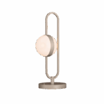 The Daisy table lamp features a sculptural metal loop, adorned with two semi-spherical opal glass shades reminiscent of gemstones held in a finely crafted setting.