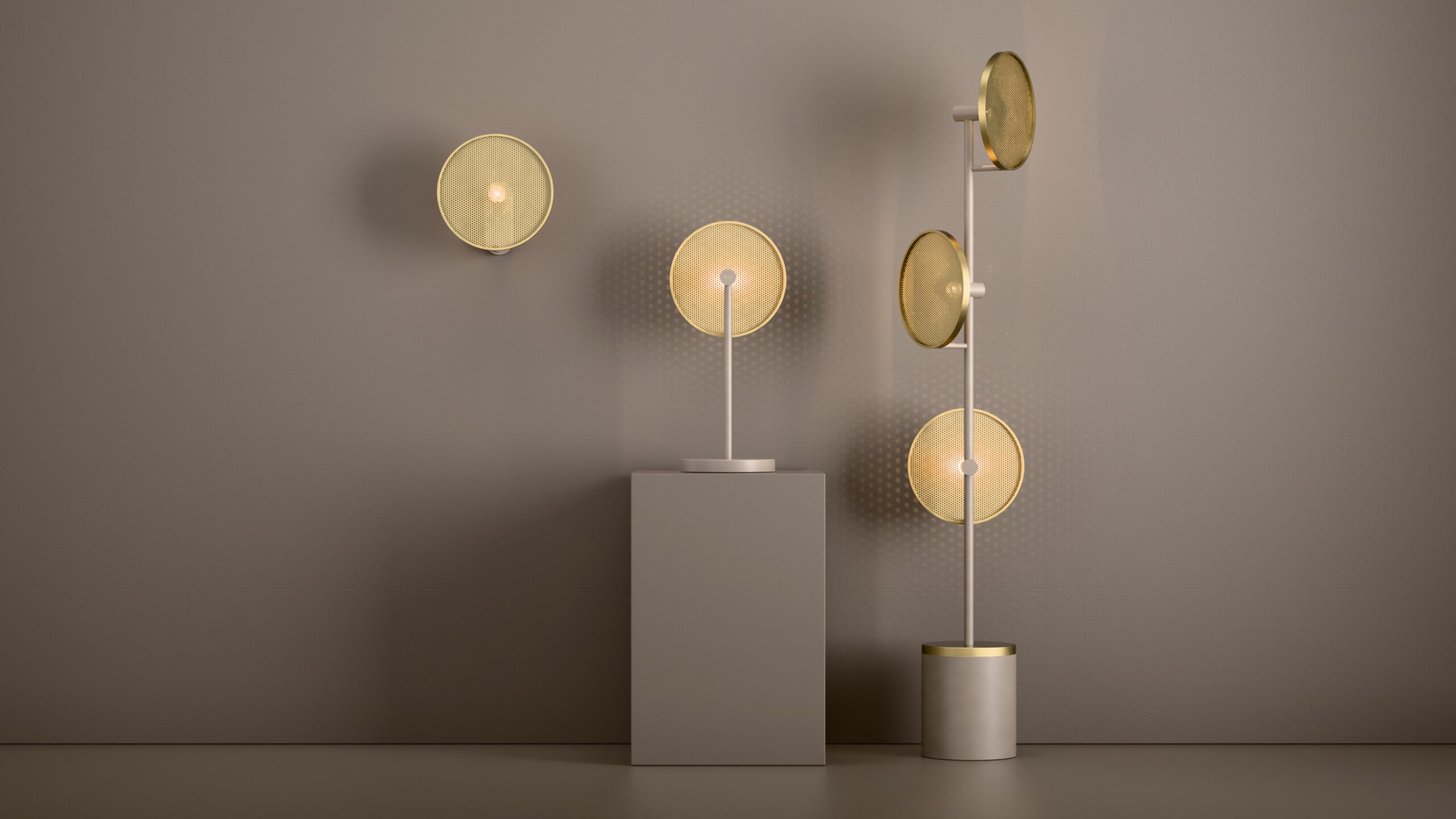 The Swizzle table lamp features a playful lollipop shape, with a perforated disc that casts captivating patterns of light against the wall.