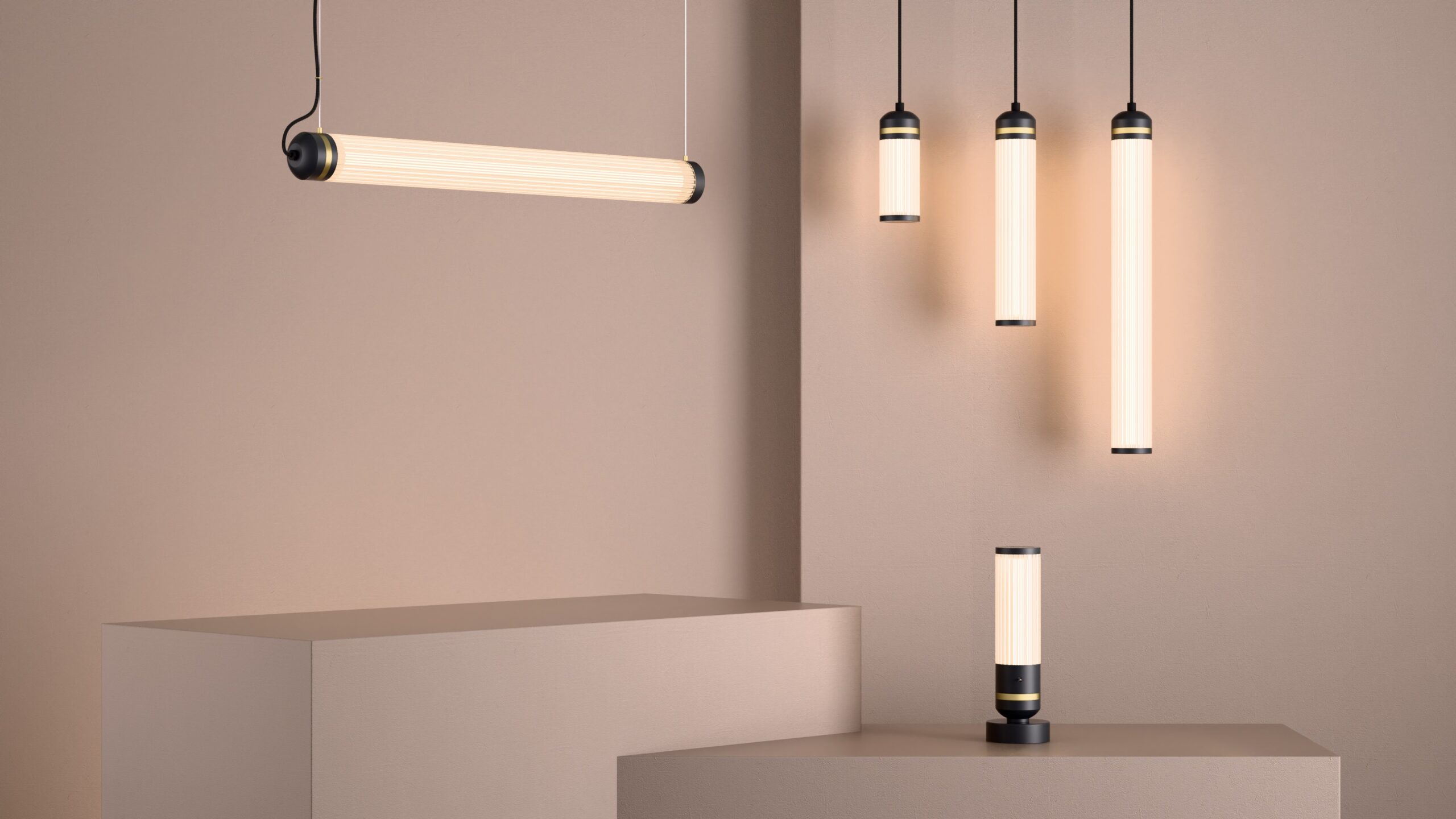 The Boston pendant has a reeded glass cylinder which encases an internal acrylic diffuser, providing even, ambient illumination.