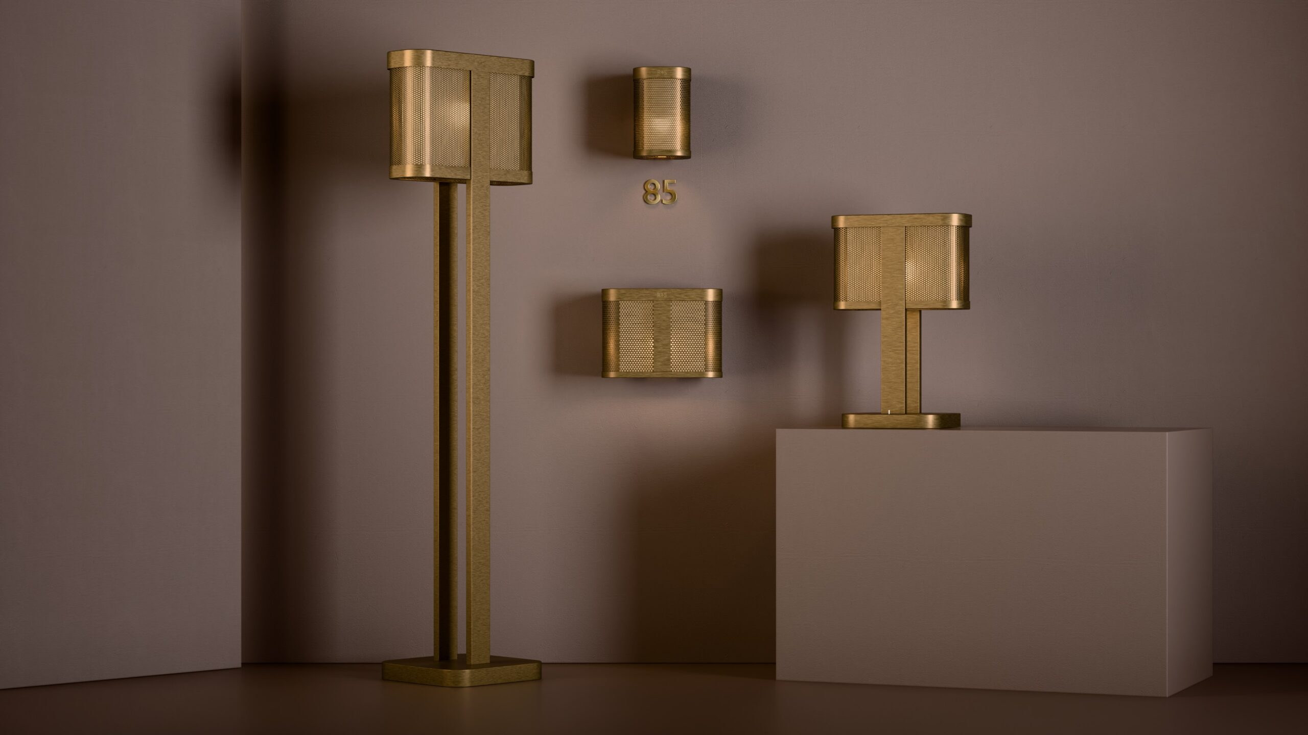 The Chicago floor lamp showcases a sleek, curved perforated shade with an internal diffuser, supported by twin rectangular stems and a broad, rounded-square base.