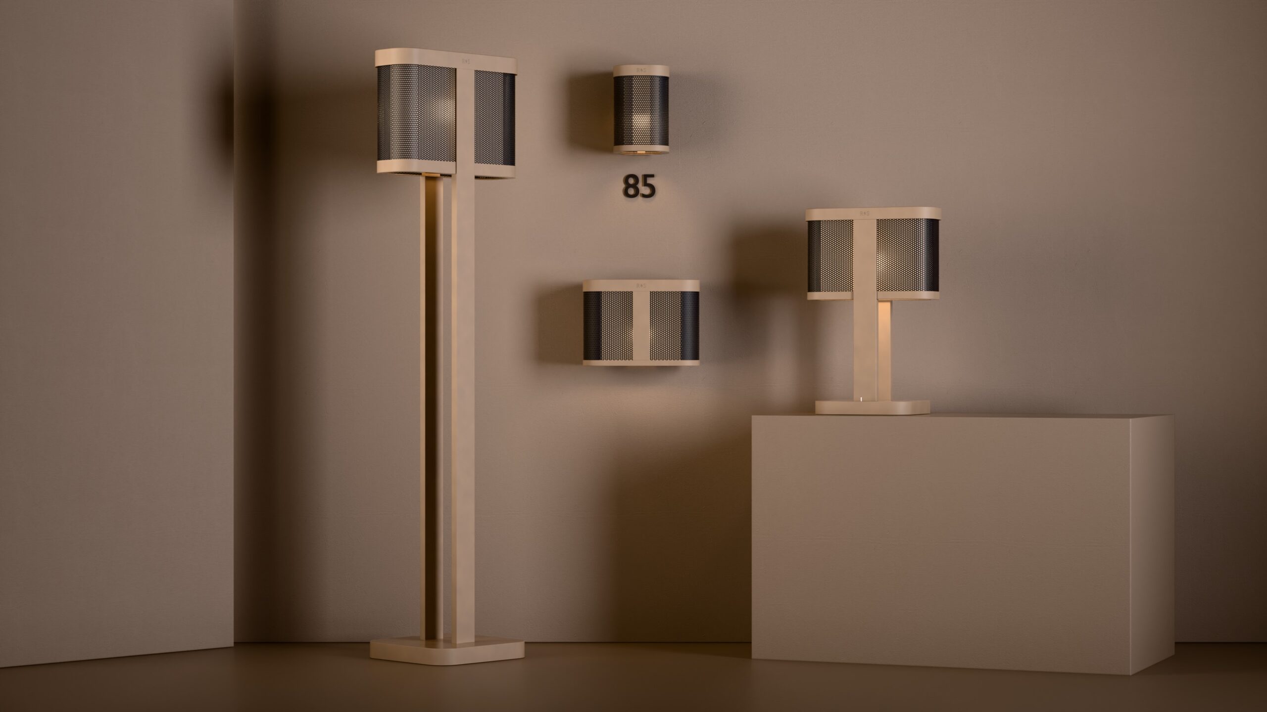 The Chicago floor lamp showcases a sleek, curved perforated shade with an internal diffuser, supported by twin rectangular stems and a broad, rounded-square base.