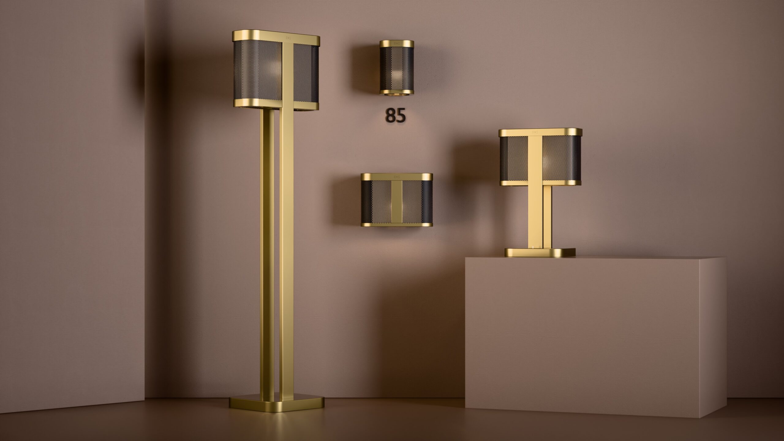 The Chicago floor lamp showcases a sleek, curved perforated shade with an internal diffuser, supported by twin rectangular stems and a broad, rounded-square base.