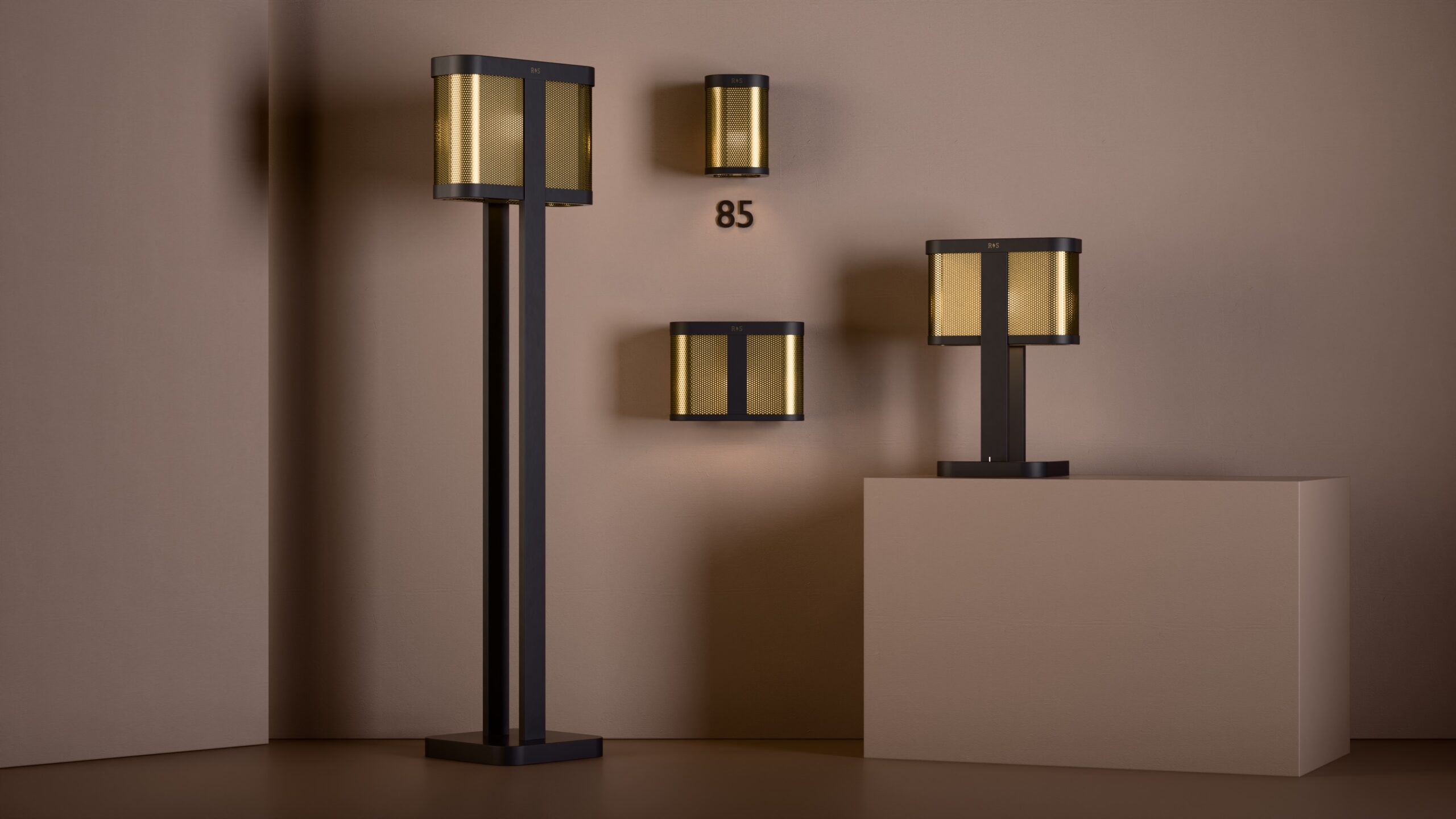 The Chicago floor lamp showcases a sleek, curved perforated shade with an internal diffuser, supported by twin rectangular stems and a broad, rounded-square base.