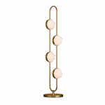 The Daisy floor lamp features a sculptural metal loop, adorned with eight semi-spherical opal glass shades reminiscent of gemstones held in a finely crafted setting.