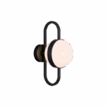 The Daisy wall light features a refined metal loop adorned with two semi-spherical opal glass shades, evocative of delicate gemstones set within a fine ring.