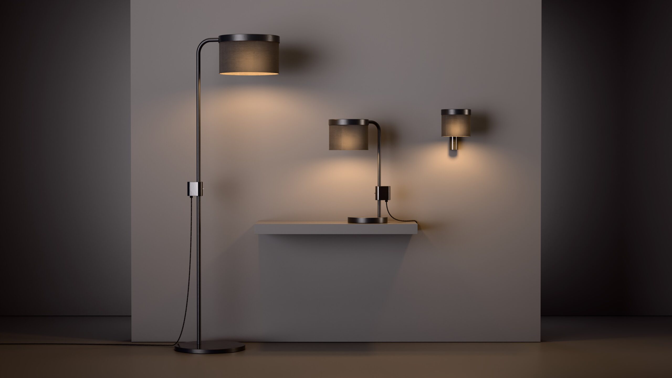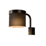The Hoop wall light has a circular frame and thin stem which is accented with a wedge detail housing a sleek, integrated toggle switch. The fitting is finished with a soft linen shade that casts a warm, ambient glow.