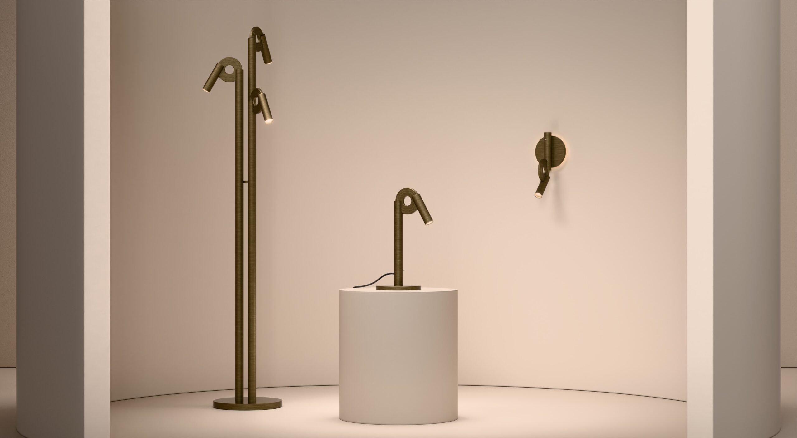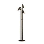 The Paris floor lamp has an arching shape and etched metal medallion rings which operate the adjustment of the heads of the fitting. The three light sources are enclosed by frosted acrylic diffusers.