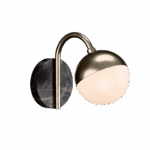The Peak wall light features a curved stem which supports an opal glass globe nestled within a recessed metal cowl.