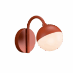The Peak wall light features a curved stem which supports an opal glass globe nestled within a recessed metal cowl.
