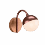 The Peak wall light features a curved stem which supports an opal glass globe nestled within a recessed metal cowl.