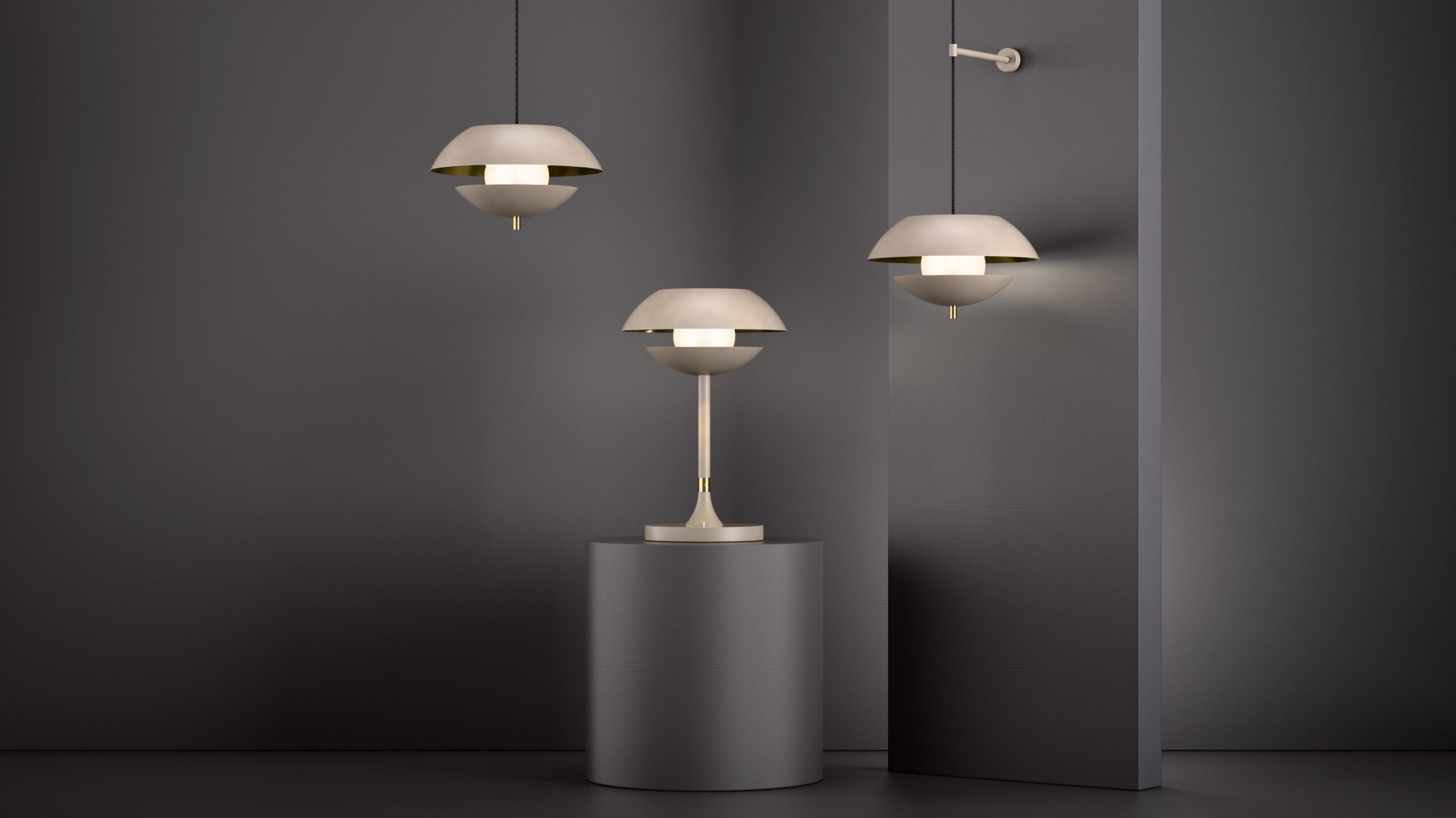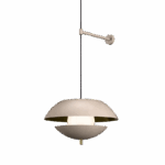 The Pearl bedside wall light features two metal cowls enclosing an opal glass globe. It is suspended with fabric cable that can be adjusted to suit any space.