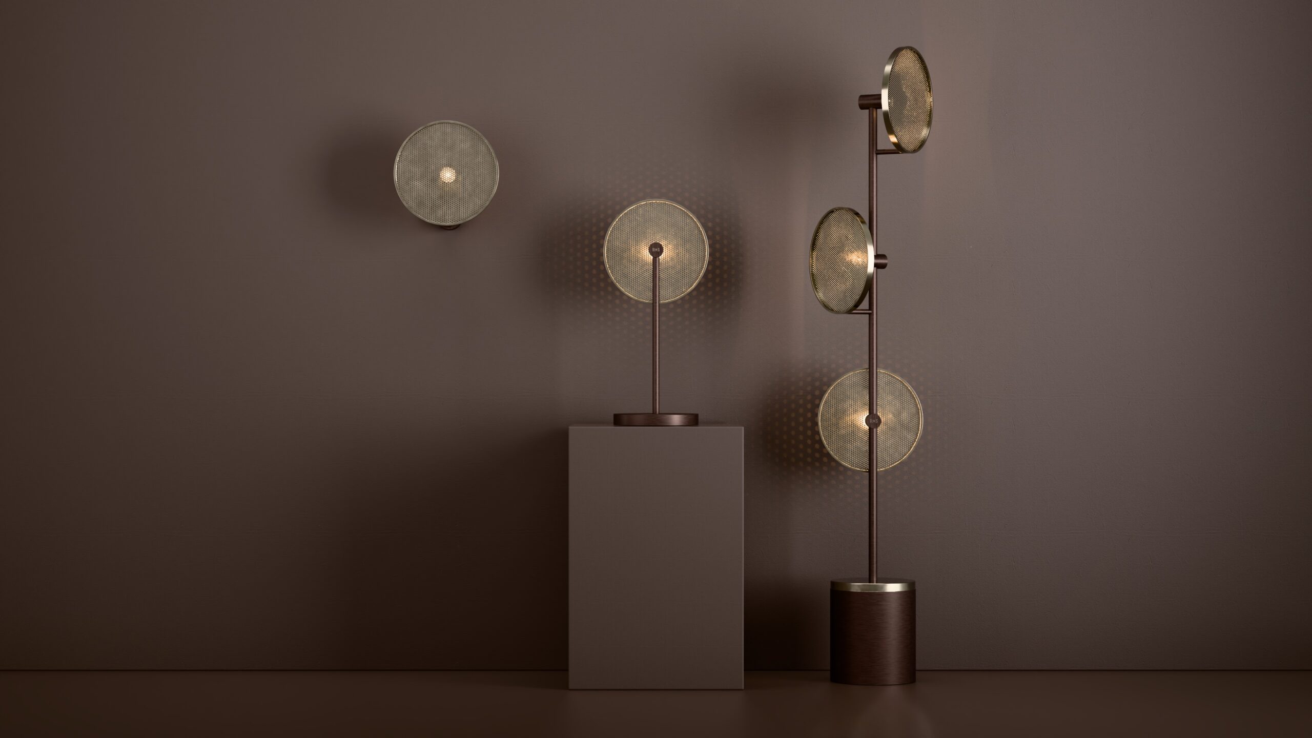 The Swizzle floor lamp features a playful lollipop shape, with a perforated discs that cast captivating patterns of light against the wall.