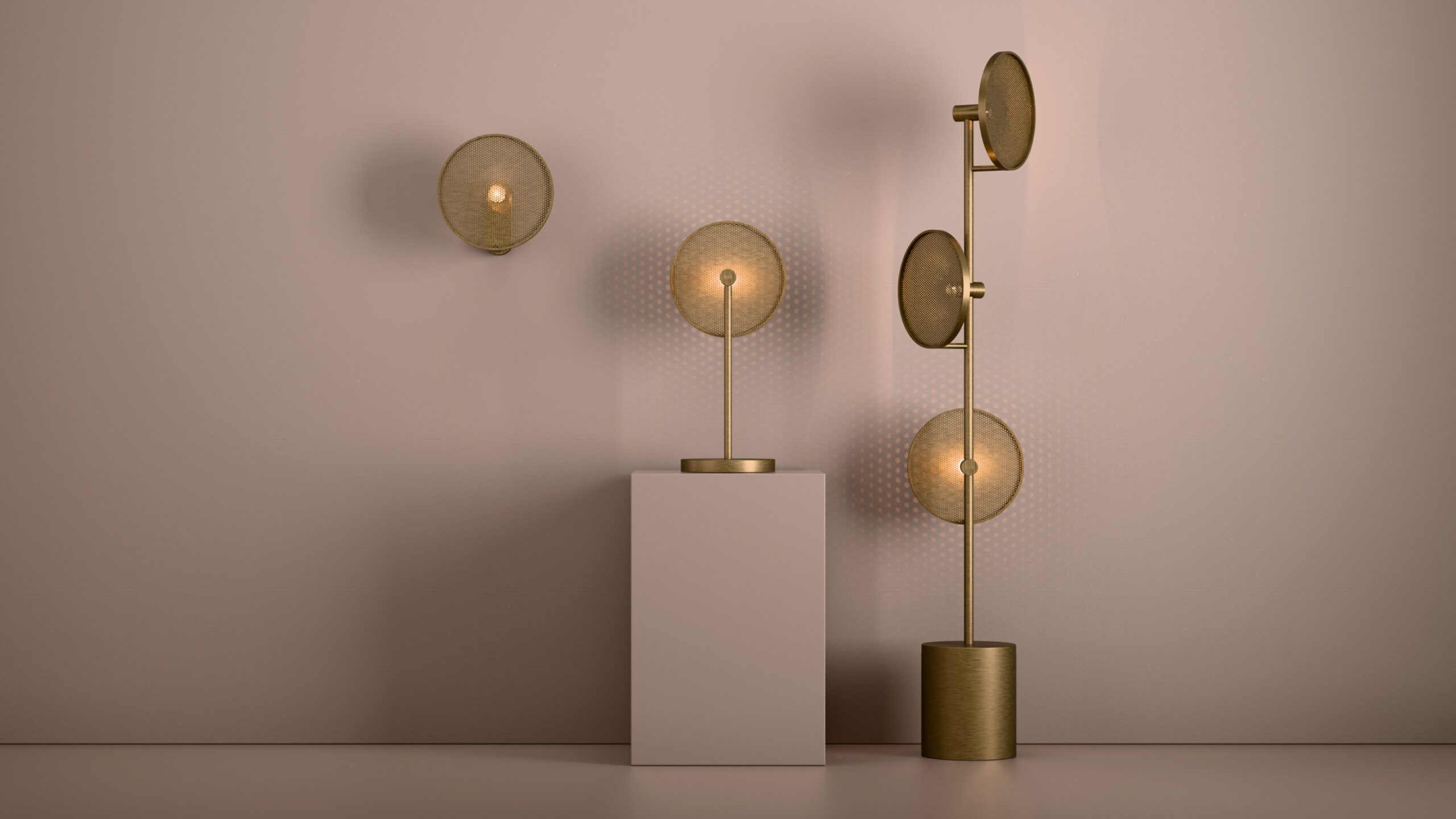 The Swizzle floor lamp features a playful lollipop shape, with a perforated discs that cast captivating patterns of light against the wall.