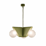 The Vienna pendant features three wedge-shaped bodies with softly glowing opal glass globes arranged in a cartwheel formation.